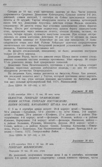 Отход 1-й армии за р. Неман. Белосток. Генералу Орановскому. Копия: Остров. Генералу Постовскому. Копия: Осовец. Начальнику штаба 10-й армии. 3 (16) сентября 1914 г. 11 час. 05 мин. ночи // Дело ЦВИА № 137—342, л. 318.
