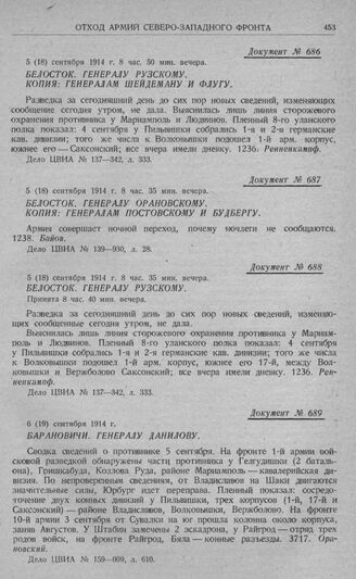 Отход 1-й армии за р. Неман. Белосток. Генералу Рузскому. Копия: генералам Шейдеману и Флугу. 5 (18) сентября 1914 г. 8 час. 50 мин. вечера // Дело ЦВИА № 137—342, л. 333.