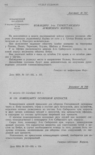 Отход 10-й армии на р. Бобр. Командиру 1-го Туркестанского армейского корпуса. Осовец. 31 августа (13 сентября) 1914 г. // Дело ВИА № 137—555, л. 155.