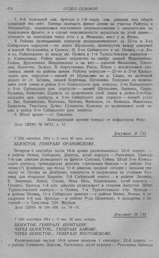 Отход 10-й армии на р. Бобр. Белосток. Генералу Леонтьеву. Через Белосток. Генералу Байову, через Белосток. Генералу Постовскому. 7 (20) сентября 1914 г. 8 час. 30 мин. вечера // Дело ЦВИА № 139—930, лл. 96—97.