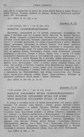 Отход 2-й армии за р. Нарев. Белосток. Начальнику штаба главнокомандующего. Через Белосток. Начальнику штаба 10-й армии. Через Белосток. Начальнику штаба 1-й армии. 6 (19) сентября 1914 г. 7 час. 40 мин. вечера // Дело ЦВИА № 5901, л. 185.