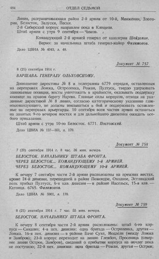 Отход 2-й армии за р. Нарев. Варшава. Генералу Ольховскому. 8 (21) сентября 1914 г. // Дело ЦВИА № 137—351, л. 170.