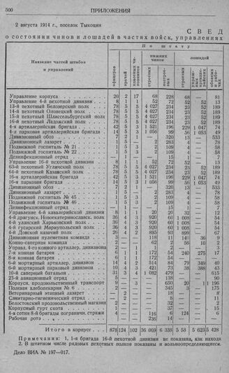 Сведения о состоянии чинов и лошадей в частях войск, управлениях и учреждениях 6-го армейского корпуса к 1 августа 1914 г. // Дело ВИА № 197—017.