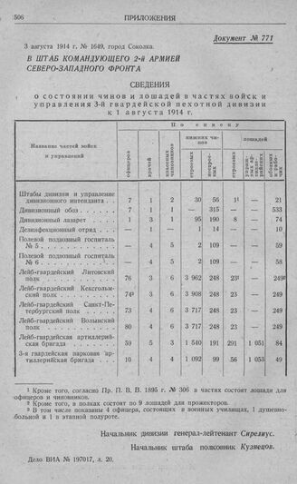 Сведения о состоянии чинов и лошадей в частях войск и управлениях 3-й гвардейской пехотной дивизии к 1 августа 1914 г.