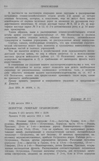 Организация и состояние тыла 2-й армии. Белосток. Генералу Орановскому. 9 (22) августа 1914 г. // Дело ВИА № 3797, л. 43.