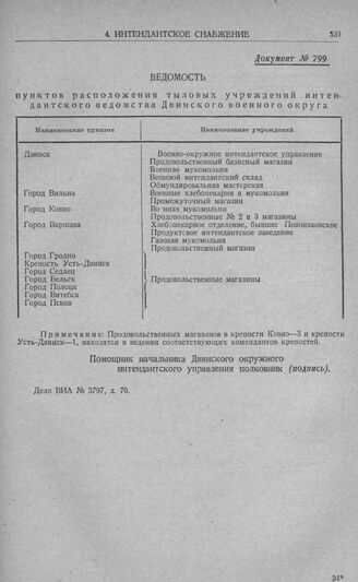 Интендантское снабжение. Ведомость пунктов расположения тыловых учреждений интендантского ведомства Двинского военного округа // Дело ВИА № 3797, л. 70.