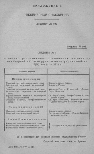 Инженерное снабжение. Сведение № 1 о местах расположения подчиненных инспектору инженерной части округа тыловых учреждений на 17(30) августа 1914 г.