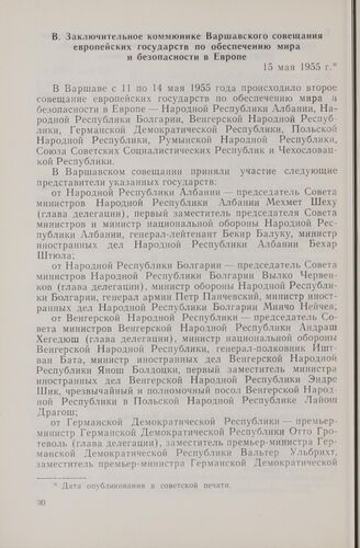 Документы совещания европейских государств по обеспечению мира и безопасности в Европе, состоявшегося в Варшаве 11-14 мая 1955 года. Заключительное коммюнике Варшавского совещания европейских государств по обеспечению мира и безопасности в Европе. 15 мая 1955 г. // Печат. по газ. «Правда», 15 мая 1955 г.