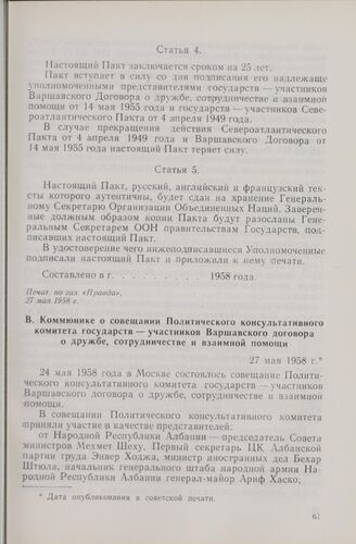 Документы совещания Политического консультативного комитета государств — участников Варшавского договора, состоявшегося в Москве 24 мая 1958 года. Коммюнике о совещании Политического консультативного комитета государств — участников Варшавского договора о дружбе, сотрудничестве и взаимной помощи. 27 мая 1958 г. // Печат. по газ. «Правда», 27 мая 1958 г.