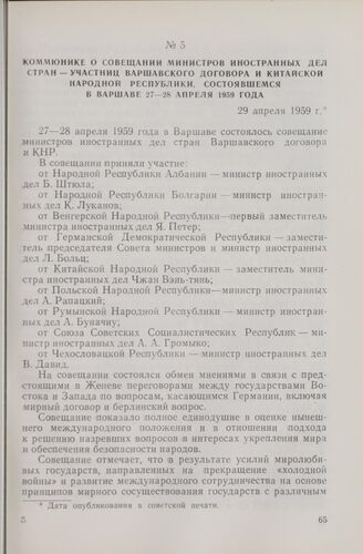 Коммюнике о Совещании министров иностранных дел стран — участниц Варшавского договора и Китайской Народной Республики, состоявшемся в Варшаве 27-28 апреля 1959 года. 29 апреля 1959 г.