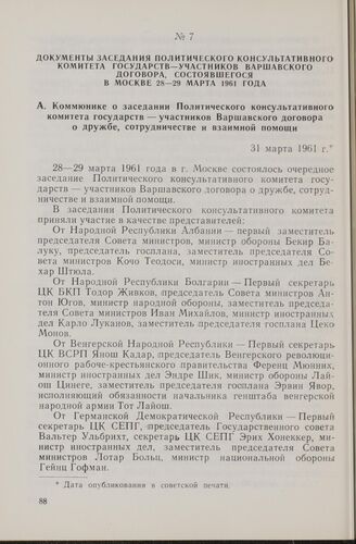 Документы заседания Политического консультативного комитета государств — участников Варшавского договора, состоявшегося в Москве 28-29 марта 1961 года. Коммюнике о заседании Политического консультативного комитета государств — участников Варшавско...