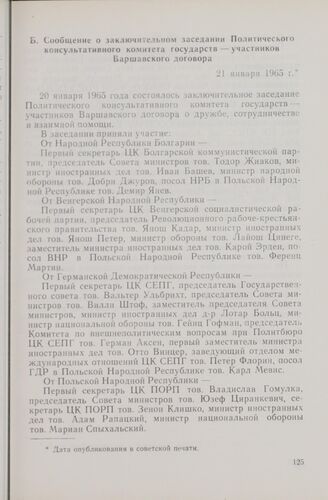 Документы совещания Политического консультативного комитета государств — участников Варшавского договора. состоявшегося в Варшаве 19-20 января 1965 года. Сообщение о заключительном заседании Политического консультативного комитета государств — участников Варшавского договора. 21 января 1965 г. // Печат. по газ. «Правда», 21 января 1965 г.