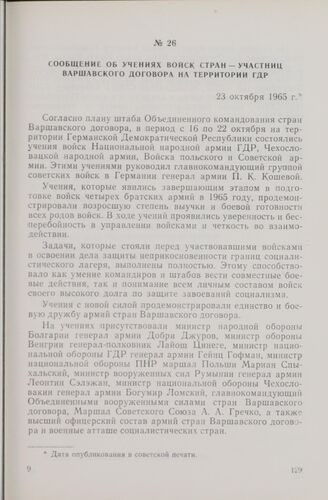 Сообщение об учениях войск стран — участниц Варшавского договора на территории ГДР. 23 октября 1965 г. // Печат. по газ. «Правда», 23 октября 1965 г.