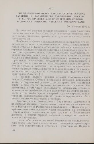 Из декларации правительства СССР об основах развития и дальнейшего укрепления дружбы и сотрудничества между Советским Союзом и другими социалистическими государствами. 30 октября 1956 г. // Печат. по газ. «Правда», 31 октября 1956 г.