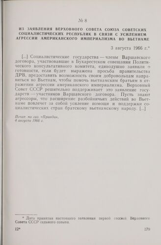 Из заявления Верховного Совета Союза Советских Социалистических Республик в связи с усилением агрессии американского империализма во Вьетнаме. 3 августа 1966 г. // Печат. по газ. «Правда», 4 августа 1966 г.