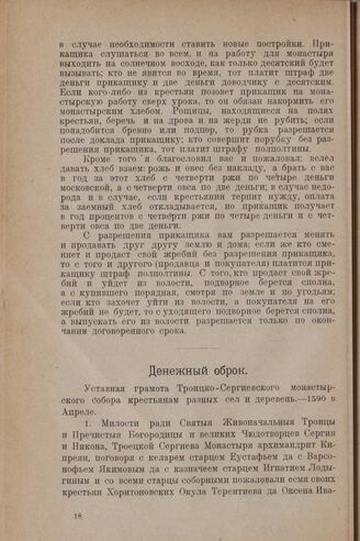 Денежный оброк. Уставная грамота Троицко-Сергиевского монастыря крестьянам 1590 года, апреля 29 // Памятники по истории крестьян XIV—XIX в., № 29.