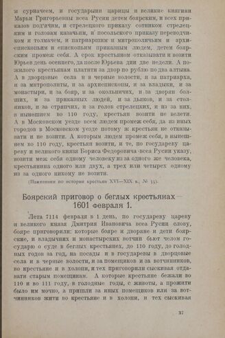 Боярский приговор о беглых крестьянах — 1601 февраля 1 // Памятники по истории крестьян XVI—XIX в., № 36.