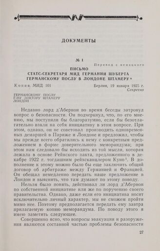 Письмо статс-секретаря МИД Германии Шуберта германскому послу в Лондоне Штамеру. Берлин, 19 января 1925 г. // Печат. по арх.