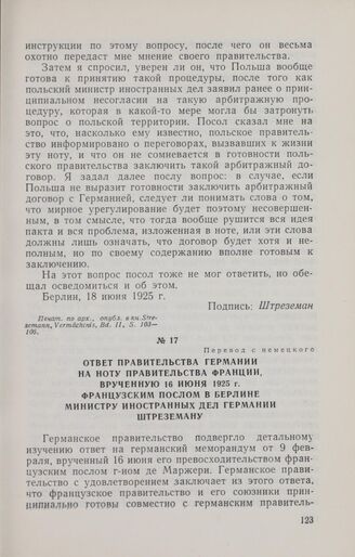 Ответ правительства Германии на ноту правительства Франции, врученную 16 июня 1925 г. французским послом в Берлине министру иностранных дел Германии Штреземану. Париж, 20 июля 1925 г. // Печат. по изд. Miscellaneous № 9, 1925, Gmd. 2468, «Reply of the German Government to the note handed to Herr Stresemann by the French Ambassador at Berlin on June 16, 1925, respecting the Proposals for a Pact of Security», p. 2—5.