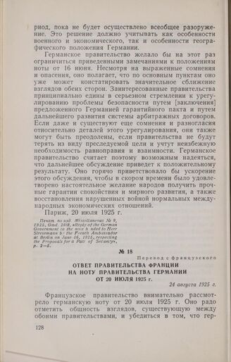 Ответ правительства Франции на ноту правительства Германии от 20 июля 1925 г. 24 августа 1925 г. // Печат. по иэд. «Pacte de Sécurité. II», Paris. 1925, p. 6—8.