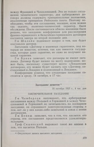 Записи заседаний Локарнской конференции. Записи заседаний, сделанные делегацией Франции. Заседание девятое. 16 октября 1925 г.