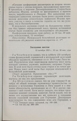 Записи заседаний Локарнской конференции. Записи заседаний, сделанные делегацией Великобритании. Заседание шестое. 12 октября 1925 г.