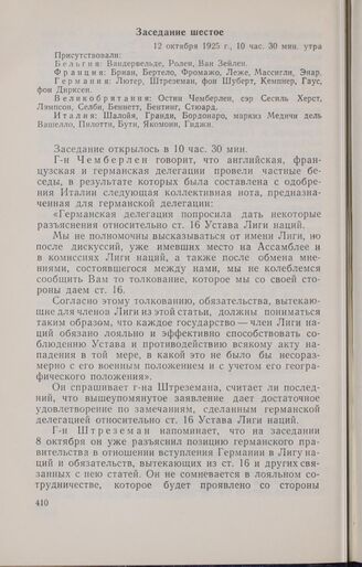 Записи заседаний Локарнской конференции. Записи заседаний, сделанные делегацией Италии. Заседание шестое. 12 октября 1925 г.