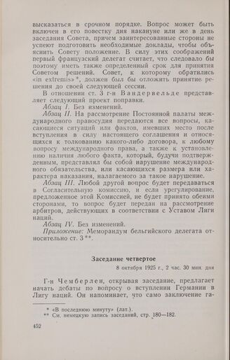 Записи заседаний Локарнской конференции. Записи заседаний, сделанные делегацией Бельгии. Заседание четвертое. 8 октября 1925 г.