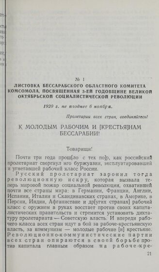 Листовка Бессарабского областного комитета комсомола, посвященная 3-ей годовщине Великой Октябрьской социалистической революции. 1920 г. не позднее 6 ноября [1] // Архив Института истории партии при ЦК КП Молдавии, ф. 49, оп. 20, ед. хр. 171, л. 2. Типографский оттиск.