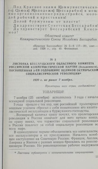 Листовка Бессарабского областного комитета Российской Коммунистической партии (большевиков), посвященная 3-ей годовщине Великой Октябрьской социалистической революции. 1920 г. не ранее 7 ноября // ЦГАОР МССР, ф. 238, оп. 1, ед. хр. 805, л. 375, Типографский оттиск.