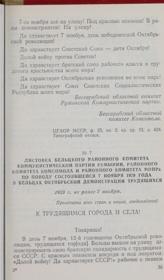 Листовка Бельцкого районного комитета Коммунистической партии Румынии, районного комитета комсомола и районного комитета МОПРа по поводу состоявшейся 7 ноября 1929 года в Бельцах Октябрьской демонстрации трудящихся. 1929 г. не ранее 7 ноября // ЦГАОР МССР, ф. 34, оп. 1, ед. хр. 3419, л. 231. Шапирогафный оттиск.