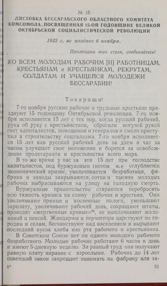 Листовка Бессарабского областного комитета комсомола, посвященная 15-ой годовщине Великой Октябрьской социалистической революции. 1932 г, не позднее 6 ноября