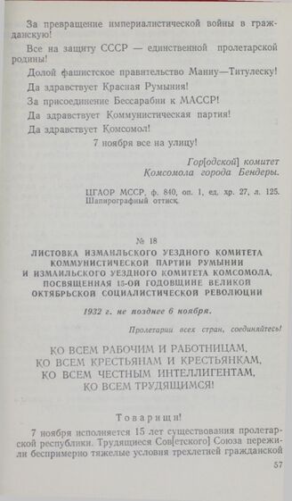 Листовка Измаильского уездного комитета Коммунистической партии Румынии и Измаильского уездного комитета комсомола, посвященная 15-ой годовщине Великой Октябрьской социалистической революции. 1932 г. не позднее 6 ноября // ЦГАОР МССР, ф. 34, оп. 1, ед. хр. 3419, л. 373. Шапирографный оттиск.