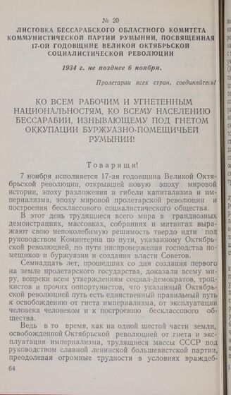 Листовка Бессарабского областного комитета Коммунистической партии Румынии, посвященная 17-ой годовщине Великой Октябрьской социалистической революции. 1934 г. не позднее 6 ноября // ЦГАОР МССР, ф. 32, оп. 1, ед. хр. 5972, л. 85. Ротаторный оттиск.
