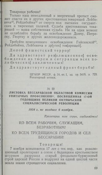 Листовка Бессарабской областной комиссии унитарных профсоюзов, посвященная 17-ой годовщине Великой Октябрьской социалистической революции. 1934 г. не позднее 6 ноября