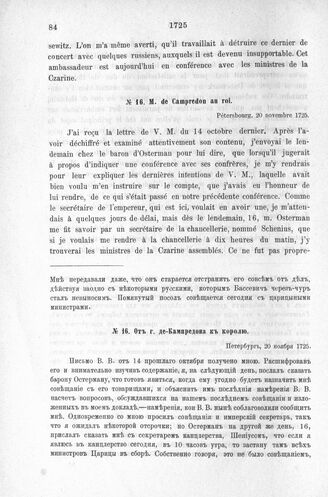 Донесения французского полномочного министра при русском дворе, Кампредона, и агента Маньяна, за 1725 и 1727 гг. От г. де-Кампредона к королю. Петербург, 20 ноября 1725 г.