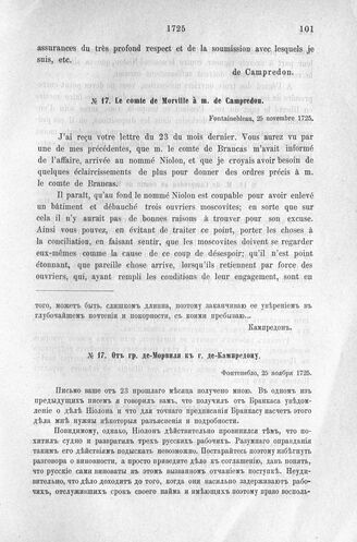 Донесения французского полномочного министра при русском дворе, Кампредона, и агента Маньяна, за 1725 и 1727 гг. От гр. де-Морвиля к г. де-Кампредону. Фонтенебло, 25 ноября 1725 г.