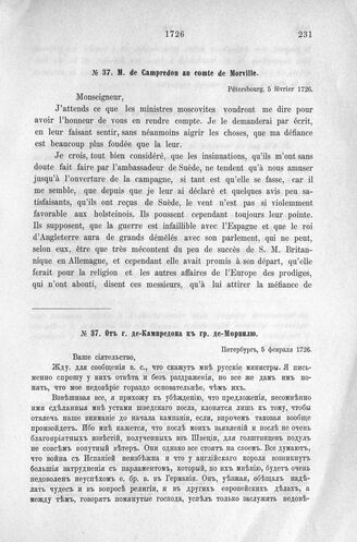 Донесения французского полномочного министра при русском дворе, Кампредона, и агента Маньяна, за 1725 и 1727 гг. От г. де-Кампредона к гр. де-Морвилю. Петербург, 5 февраля 1726 г.
