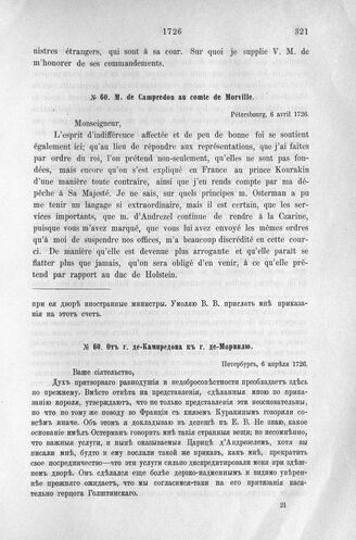Донесения французского полномочного министра при русском дворе, Кампредона, и агента Маньяна, за 1725 и 1727 гг. От г. де-Кампредона к г. де-Морвилю. Петербург, 6 апреля 1726 г.