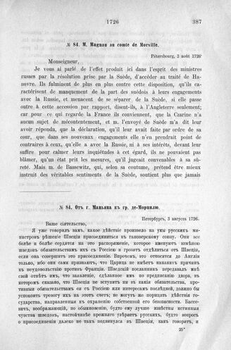 Донесения французского полномочного министра при русском дворе, Кампредона, и агента Маньяна, за 1725 и 1727 гг. От г. Маньяна к гр. де-Морвилю. Петербург, 3 августа 1726 г.