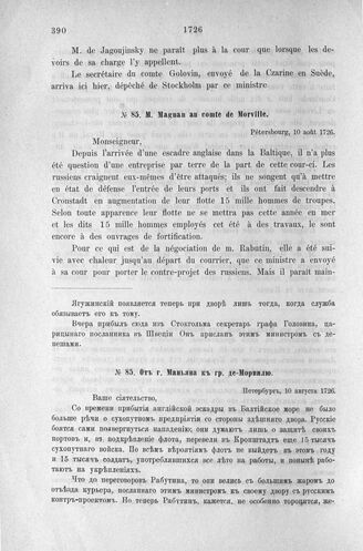 Донесения французского полномочного министра при русском дворе, Кампредона, и агента Маньяна, за 1725 и 1727 гг. От г. Маньяна к гр. де-Морвилю. Петербург, 10 августа 1726 г.