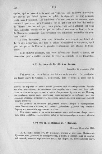 Донесения французского полномочного министра при русском дворе, Кампредона, и агента Маньяна, за 1725 и 1727 гг. От гр. де-Морвиля к г. Маньяну. Версаль, 12 сентября 1726 г.