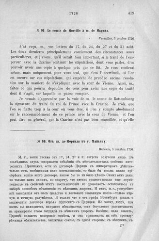 Донесения французского полномочного министра при русском дворе, Кампредона, и агента Маньяна, за 1725 и 1727 гг. От гр. де-Морвиля к г. Маньяну. Версаль, 3 октября 1726 г.