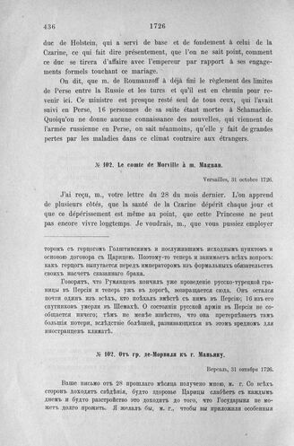 Донесения французского полномочного министра при русском дворе, Кампредона, и агента Маньяна, за 1725 и 1727 гг. От гр. де-Морвиля к г. Маньяну. Версаль, 31 октября 1726 г.