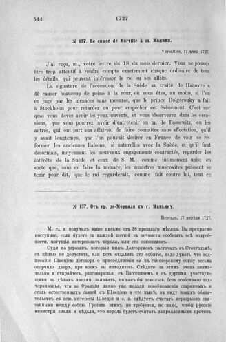 Донесения французского полномочного министра при русском дворе, Кампредона, и агента Маньяна, за 1725 и 1727 гг. От гр. де-Морвиля к г. Маньяну. Версаль, 17 апреля 1727 г.