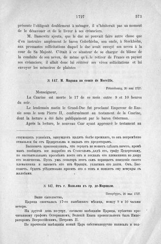 Донесения французского полномочного министра при русском дворе, Кампредона, и агента Маньяна, за 1725 и 1727 гг. От г. Маньяна к гр. де-Морвилю. Петербург, 20 мая 1727 г.