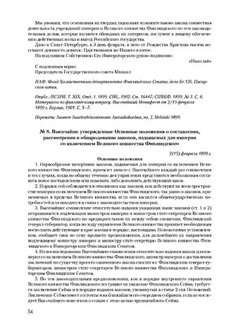 Высочайше утвержденные Основные положения о составлении, рассмотрении и обнародовании законов, издаваемых для империи со включением Великого княжества Финляндского. 3(15) февраля 1899 г. // Опубл.: ПСЗРИ. Том XIX. Отд. 1. 1899. СПб., 1902. Ст. 16447; Материалы по финляндскому вопросу. Высочайший Манифест от 3/15 февраля 1899 г. Берлин, 1901. С. 7-9.
