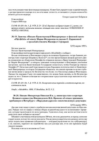 Письмо Императора Николая II и. д. министра статс-секретаря Великого княжества Финляндского В.Б. Прокопе об отказе принимать прибывшую в Петербурге «Народным адресом» многочисленную депутацию. 5(17) марта 1899 г. // Опубл.: В. Семенников. Николай Романов и Финляндия // Красный архив. 1928. № 8(27). С. 230.