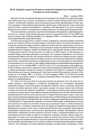 Справка о проектах Устава но воинской повинности и позиции Сейма и Сената по этому вопросу. Июль — октябрь 1899 г.