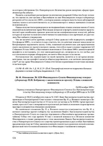 Отношение № 1258 Финляндского Сената Финляндскому генерал-губернатору Н.И. Бобрикову с заключением по проекту Устава о воинской повинности. 16(28) ноября 1899 г. // РГИА. Ф. 1149. Оп. 13. 1901 г. Д. 34. Л. 899-899 об. Типографский текст.